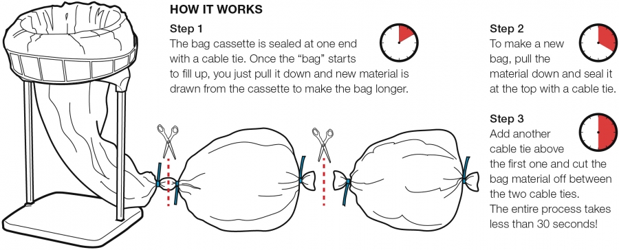 It is hygienic since the bags are replaced and sealed from the outside – there is no contact with the waste. It is based on an extremely thin and strong 3-layer polyethylenematerial.